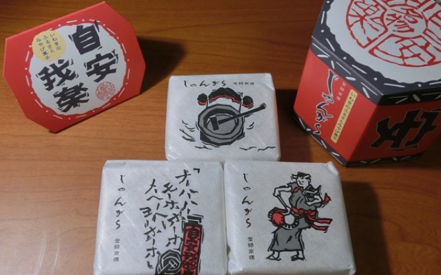 - 3個入りの箱は、じゃんがらの太鼓に似せている