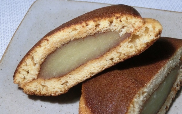 普通のどら焼きよりも日焼けした生地。びっしり詰まったあんこは白あんをベースとしたレモン色です。
