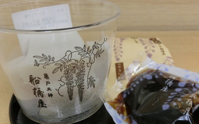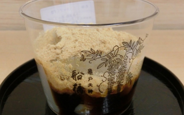 亀戸天神で藤棚を観賞したあと、船橋屋の前を通ったら行列ができていました。ここでは亀戸名物「元祖くず餅」が食べられるとのこと。