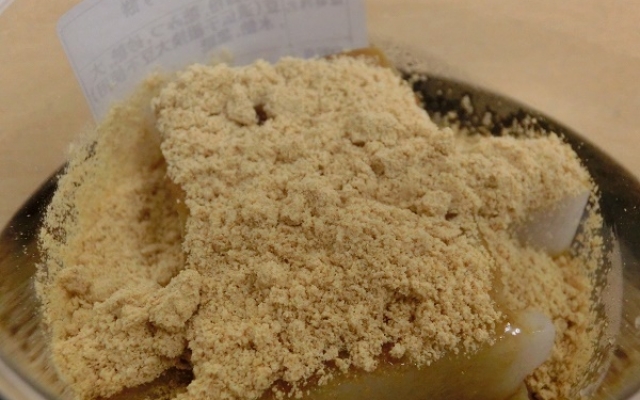 - 粗目に挽いた香ばしいきな粉と、沖縄産黒糖を使った濃厚黒蜜をかけて食べる