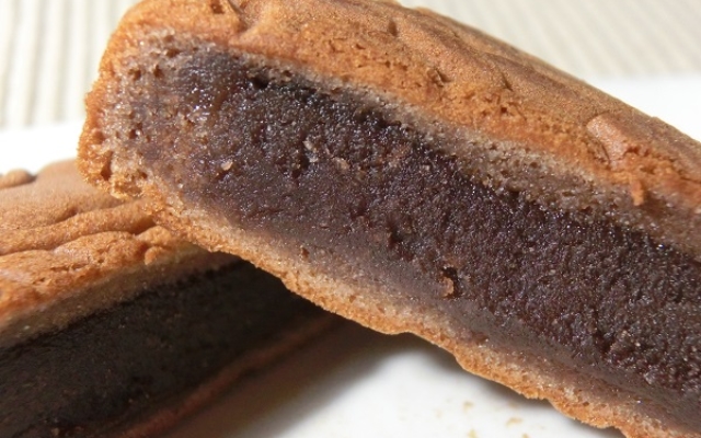 ほど良くモチモチしたもみじ饅頭のようなカステラ生地の中に、チョコ味のなめらかなあんこが詰まっています。